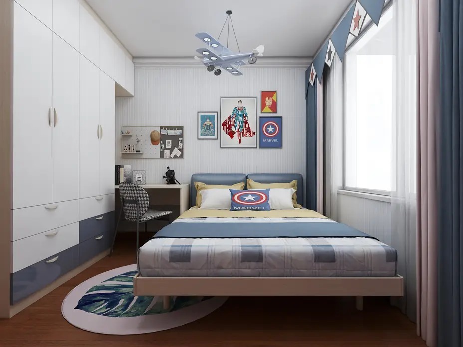 爱护孩子的心,陪伴孩子健康成长是所有家长共同的愿望,因此男孩房的设计花了加倍的心思。除了确保睡眠需求、收纳需求和学习需求,软装配饰上还将美国队长、超人、飞机等男孩子喜欢的元素结合起来,让整个空间都变得十分可爱。